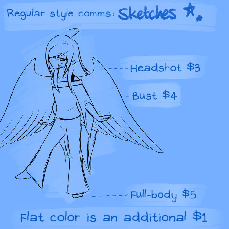 PLEASE KEEP AN EYE ON THAT POST TO SEE IF COMMS ARE OPEN OR NOT!! I will close them from time to time and I will always update that post when I do.I DID AN OOPS AND FORGOT TO PUT IN HALF-BODY SHOTS FOR MY REGULAR STYLE COMMS. I'M ALSO UPDATING FULL-BODY PRICES FOR SKETCHES. SO HERE THEY ARE: